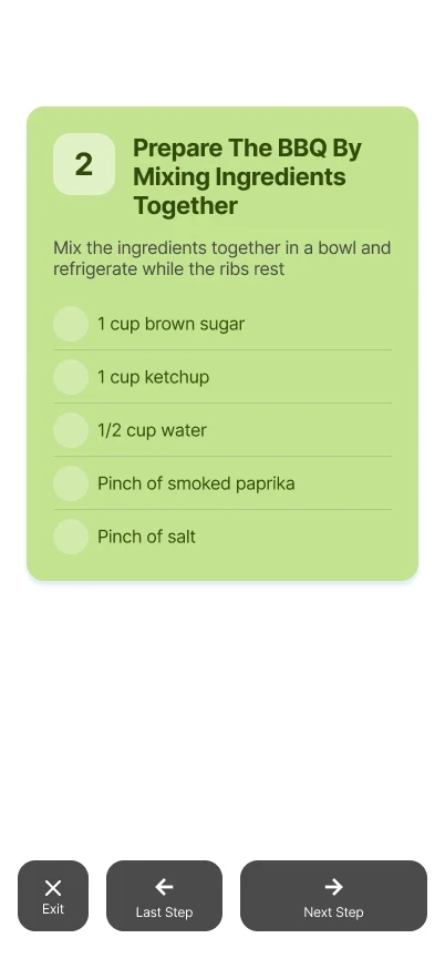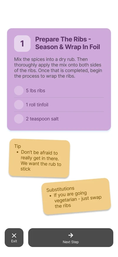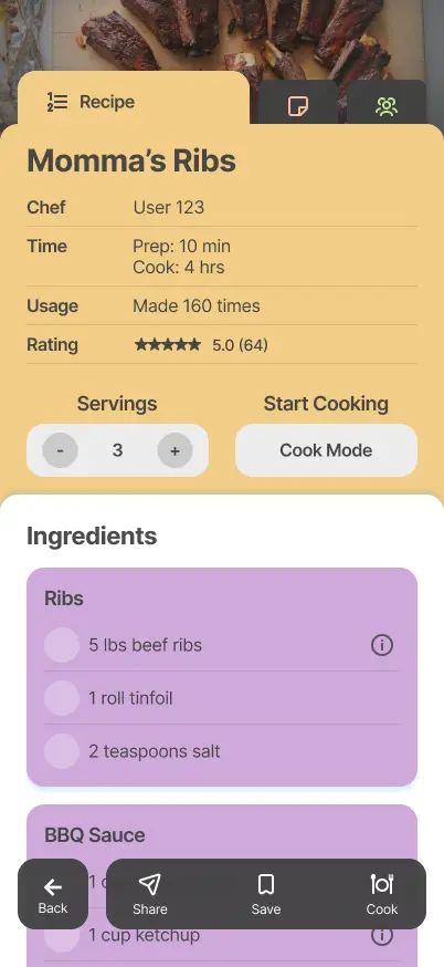 Once a user finds a recipe they like, they can use the navigation bar to enter Cook Mode. This provides a focused step by step view alongside the necessary ingredients.