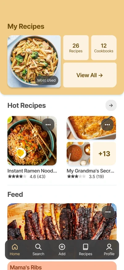 Users can quickly see & access their recipes. By scrolling they are able to explore popular recipes and a feed from chefs & friends they follow.