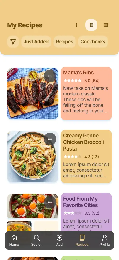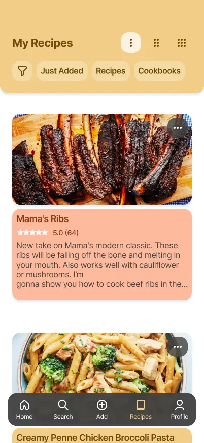 Here users can access a library of their saved recipes & cookbooks. They can adjust the view to get more details or a higher level view.