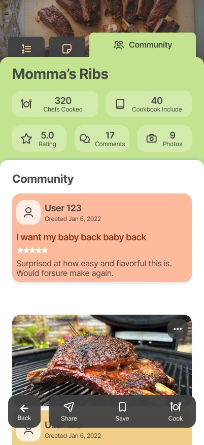 By clicking into a specific recipe, Users are initially presented with key information such as rating, serving size, ingredients , & instructions. Through the tabs, they can navigate to see some additional context from the Chef as well as community reviews.